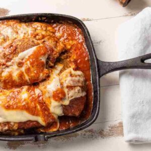 Milanesa de ternera gratinada con salsa de tomate y queso.