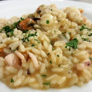 Arroz con langostinos, mejillones, almejas, berberechos, calamar y queso grana padano.